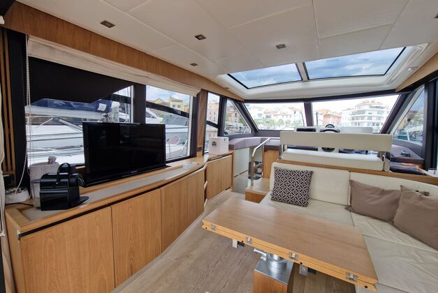 Le salon, doté de nombreux rangements d'un sofa modulable et d'une TV escamotable, est particulièrement lumineux grâce à la très grande surface vitrée du bateau ainsi qu'à son toit ouvrant électrique.
