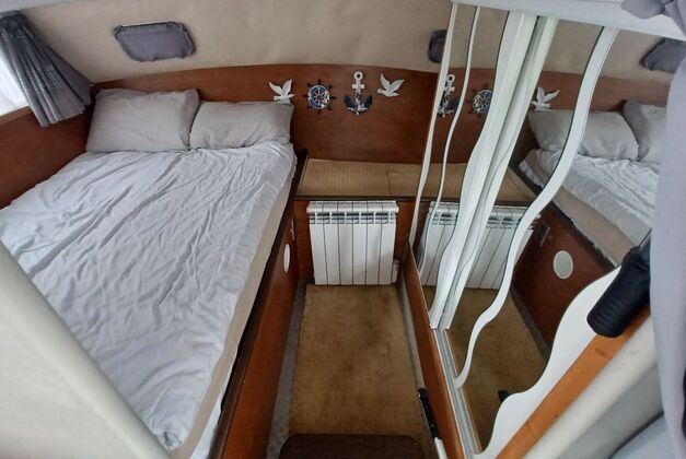 1 cabine arrière spacieuse avec un lit 2 places et 1 penderie, 1 grand carré avec le salon et la timonerie, 1 belle cuisine aménagée, salle de bain avec lavabo, douchette et wc. Le bateau est bien équipé :