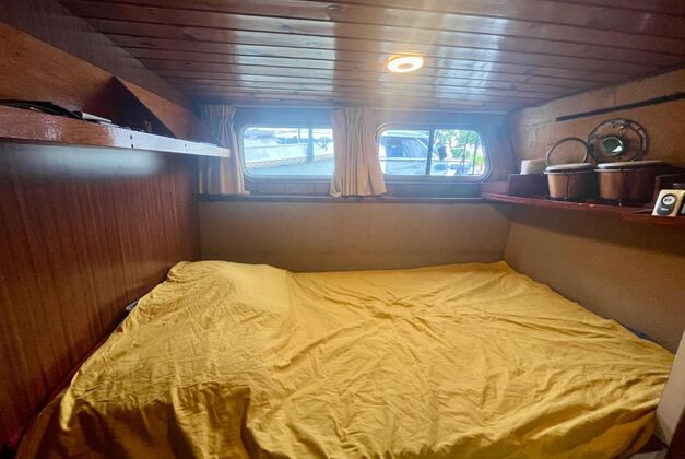 1 cabine avec 1 lit 2 places et 1 lit 1 place, 1 grand carré avec le salon et la timonerie, 1 cuisine, salle de bain avec douche et WC séparés, bien équipé :