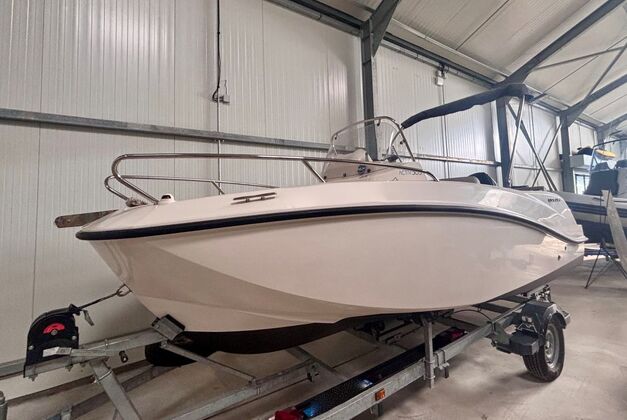 Très beau Quicksilver Activ 505 de 2014 en état comme neuf, moteur Mercury 80 cv de 2017 avec seulement 180 heures, le prix comprend la remorque Nautilus 1100 kg de PTAC de 2014. Le bateau est bien équipé :