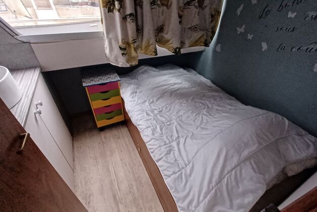1 cuisine aménagée avec plaque de cuisson 4 feux au gaz, frigo, micro-onde, ballon d’eau chaude électrique 15 L et nombreux rangements.