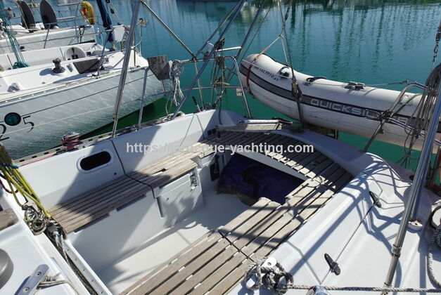 Guindeau électrique. Mouillage principal ancre + chaîne + câblot. 2 Taquets de maître-bau. Capote de roof. Bimini. Barre franche. Chaise pour le stockage d’un hors-bord. Echelle de bain. Douchette de cockpit. Davier sur l’arrière tribord, pour un éventuel mouillage secondaire. Portique arrière, support panneau solaire et bossoirs d’annexe. Emplacement à l’arrière du cockpit pour un éventuel radeau de survie.