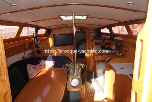 1 Cabine double avant. 1 Table à carte sur tribord. 1 Carré en U sur bâbord. 1 Cuisine en long sur tribord. 1 Cabinet de toilette WC marins avec réservoir à eaux noires, douche lavabo, arrière bâbord. 1 Cabine double arrière tribord.